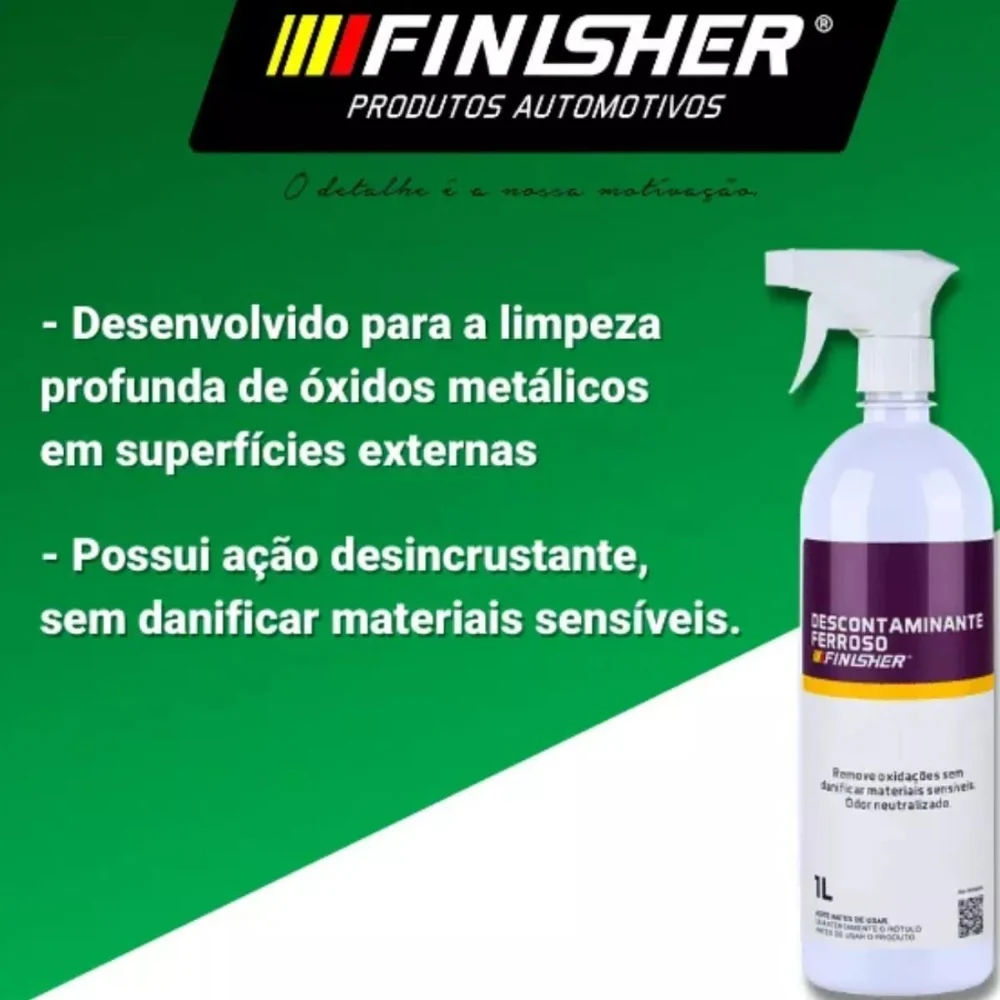 Pronto para elevar sua rotina de limpeza e manutenção? O Descontaminante Ferroso Spray 1L Finisher é um complemento essencial para o seu kit de ferramentas, permitindo obter superfícies impecáveis e livres de contaminantes com facilidade e eficiência.