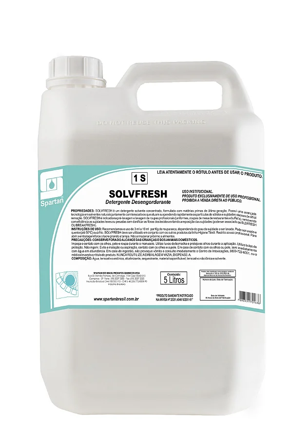 Com embalagem de 5 litros, o Detergente Desengraxante Solvfresh da Spartan garante excelente custo-benefício. Sua fórmula concentrada exige apenas uma pequena quantidade do produto para um desempenho excepcional, permitindo que você economize enquanto desfruta de resultados profissionais. Mais limpeza em menos tempo e com menor desperdício tornam este detergente a escolha perfeita.