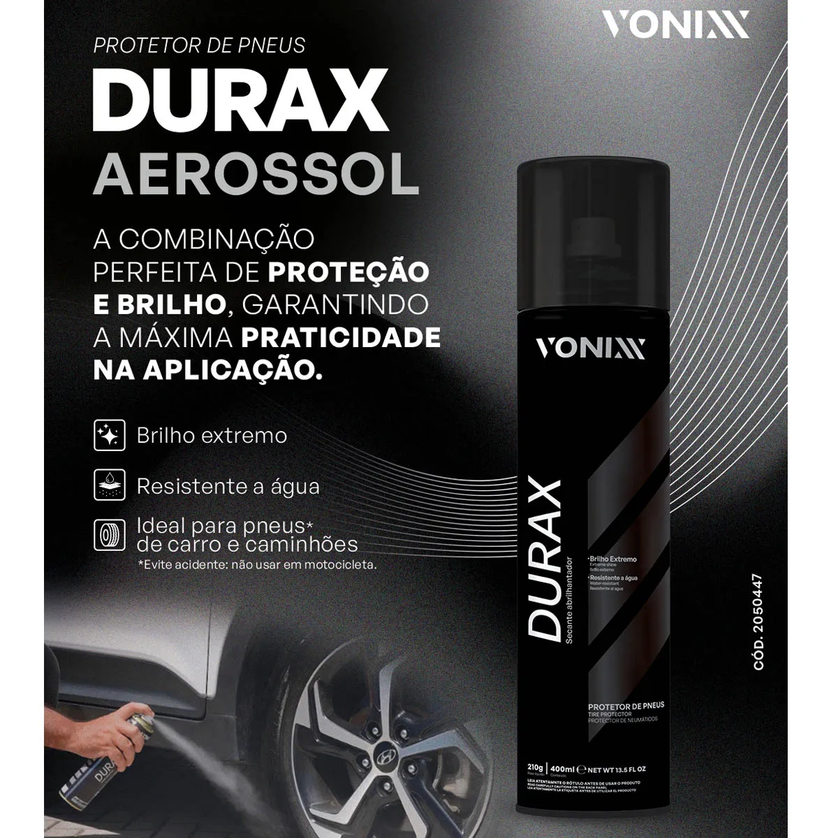Além de conferir um brilho especial, DURAX Protetor de Pneus Aerossol 400ml Vonixx cria uma barreira protetora que repele sujeira, poeira e ação dos raios UV. Este cuidado extra prolonga a vida útil dos pneus e preserva sua aparência original por muito mais tempo. Ideal para enfrentar as adversidades do dia a dia ou condições climáticas desafiadoras, este protetor atende tanto às necessidades estéticas quanto funcionais.