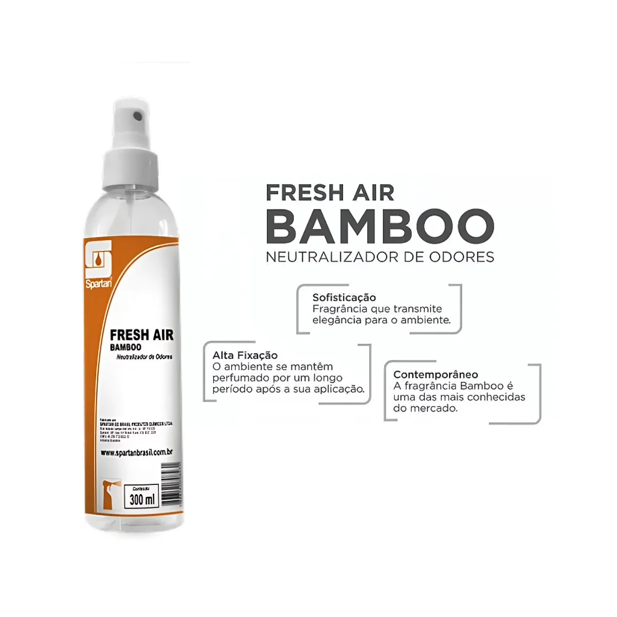 O Odorizante Fresh Air Bamboo 300ml da Spartan é um produto desenvolvido para perfumar e neutralizar odores desagradáveis em diversos tipos de ambientes. Ele é especialmente eficaz contra odores de tabaco, mofo e urina.