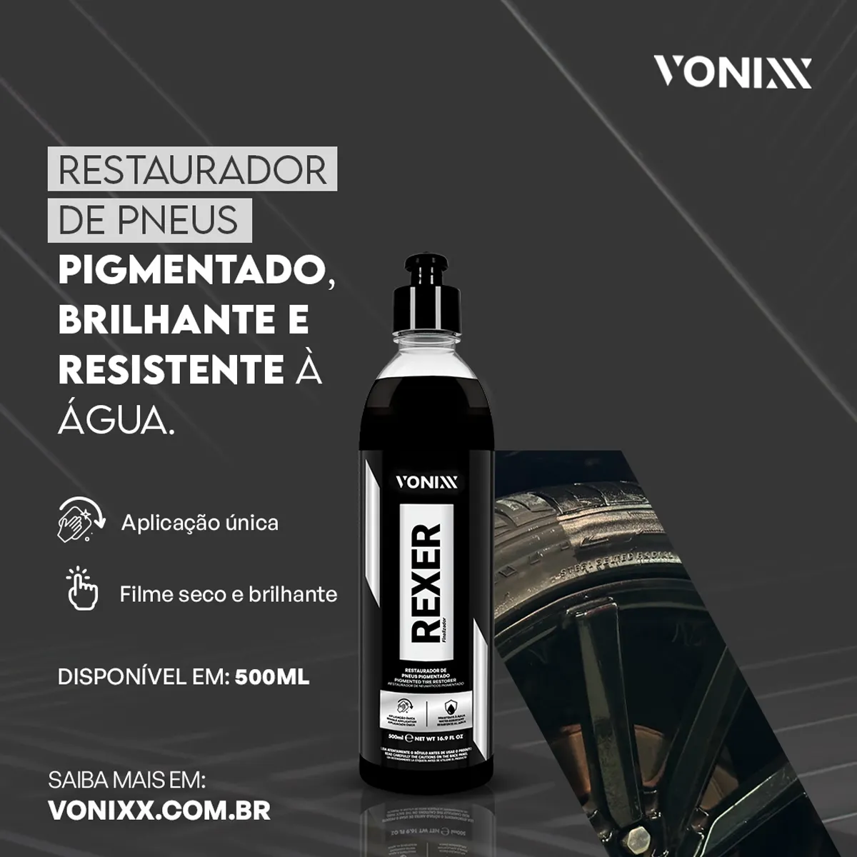 Ao utilizar o REXER Restaurador de Pneus Pigmentado, você não apenas melhora a estética dos pneus, como também contribui para sua durabilidade. O produto age como uma barreira protetora contra os efeitos da exposição ao sol e ao desgaste, prolongando a vida útil dos pneus. Por ser fabricado pela renomada marca Vonixx, ele é formulado com ingredientes seguros, garantindo um uso sem riscos e resultados confiáveis.