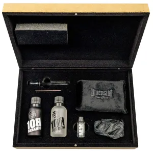 O vitrificador cerâmico 10H da Dimension Customs, também conhecido como Dimension Car Care 10H, é um revestimento com alta concentração de sólidos, desenvolvido com resinas cerâmicas alemãs. Sua aplicação é exclusiva para profissionais credenciados pela marca, e o rastreamento é feito por meio do aplicativo Dimension Connect. O tratamento oferece um nível de dureza 10H, proteção UV e um acabamento com alto brilho e repelência à água.